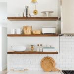 Пространството над работния плот е най-подходящо за инсталиране на отворени рафтове. Правоъгълната версия на тесен продукт е доста лесна за изпълнение. За да направите това, изрежете парче от необходимите размери от дървена дъска. След това трябва да лакирате дървото и да изчакате, докато изсъхне. След това трябва да прикрепите панти към задния край на дъската. След това в стената се правят дупки, маркирани предварително. В тях се вкарват дюбели-нокти, след което просто трябва да закачите рафта на пантите.