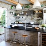 Камък (изкуствен и естествен). Рафтовете от този материал изглеждат солидни и масивни във вътрешността на кухнята. При самостоятелно сглобяване на такива конструкции е необходимо да се осигури тяхната надеждна фиксация, тъй като те са доста тежки. Слабите крепежни елементи може да не поддържат масите на каменни рафтове. Идеалното място за такива продукти е по-близо до пода. Цената на каменните мебели е доста висока, така че те са рядкост. Снимките от този тип рафтове ви позволяват да оцените техния стилен външен вид.