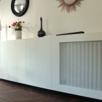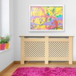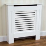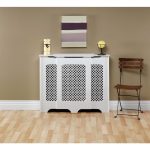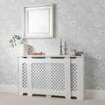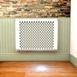The screen for a heating radiator made of MDF is made of perforated panels, which are framed by a frame made of the same material.