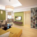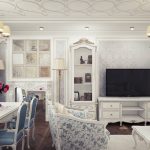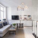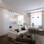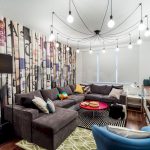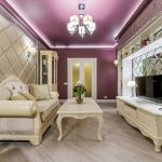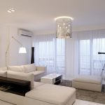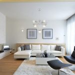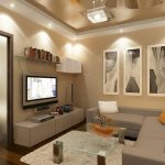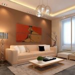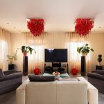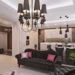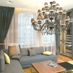 W przypadku małej sali można wybrać te same modele opraw oświetleniowych o różnych kolorach. W tym przypadku żyrandol w jasnym odcieniu jest instalowany bliżej strefy miękkiej, a produkt w ciemnym wzorze przesuwa się na koniec pomieszczenia. Na zdjęciu żyrandoli we wnętrzu salonu pokazano różne opcje lokalizacji.