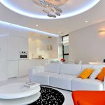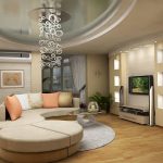 Okrągły żyrandol jest w stanie dodać tajemniczości i tajemniczości do wnętrza. Zdjęcia nowoczesnych żyrandoli w salonie podkreślają lakoniczność i wyrafinowanie modeli, dzięki czemu pasują do większości stylów wnętrz. Żyrandol w kształcie pierścienia stanie się prawdziwą ozdobą pomieszczenia. Może być kaskadowy, wielopoziomowy i mieć różne długości. Wybierając żyrandol w salonie z niskim sufitem, powinieneś preferować opcje mieszkania. Taka konstrukcja nie przeciąża przestrzeni.