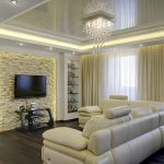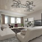Nie należy kupować żyrandola do sufitu napinanego w salonie w postaci płyty z metalowym korpusem, a opcje żyrandoli z ramionami skierowanymi do góry są również wykluczone. Spowoduje to tworzenie się czarnych kół na suficie. Tutaj preferowane są konstrukcje, w których odcienie są skierowane w dół lub na boki.