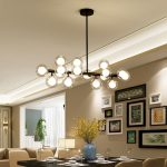 Poziomy podwieszony model żyrandola o wysokości do 0,5 m będzie wyglądał najbardziej ekologicznie w hali z sufitem napinanym, w pomieszczeniach z wysokimi sufitami wartość ta może sięgać 1 m.