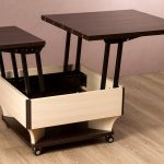 รูปแบบที่น่าสนใจที่สุดในประเภทโครงสร้างพับที่ระบุไว้คือโต๊ะทานกาแฟที่ถูกต้องซึ่งด้วยการเคลื่อนไหวเล็กน้อยของมือจะเปลี่ยนเป็นเฟอร์นิเจอร์เต็มรูปแบบได้อย่างรวดเร็ว นี่คือผลิตภัณฑ์มัลติฟังก์ชั่นรุ่นล่าสุดที่ได้รับความนิยมอย่างรวดเร็วในตลาดเฟอร์นิเจอร์ ข้อดีหลักของการเปลี่ยนตาราง: